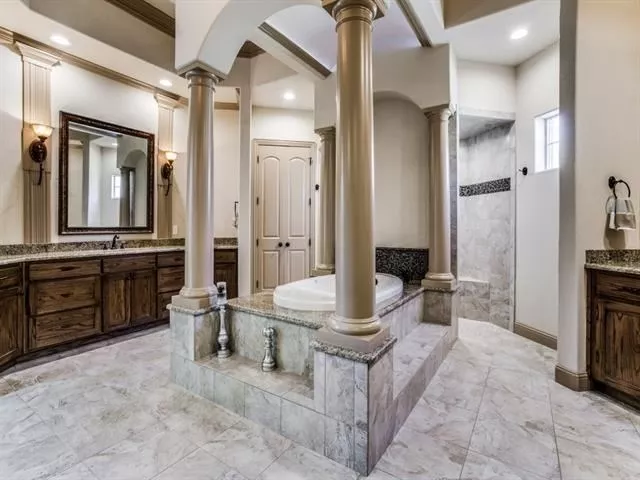 bath that includes a his and hers vanity and a center tile luxury Jett bath tub embellished by massive pillars