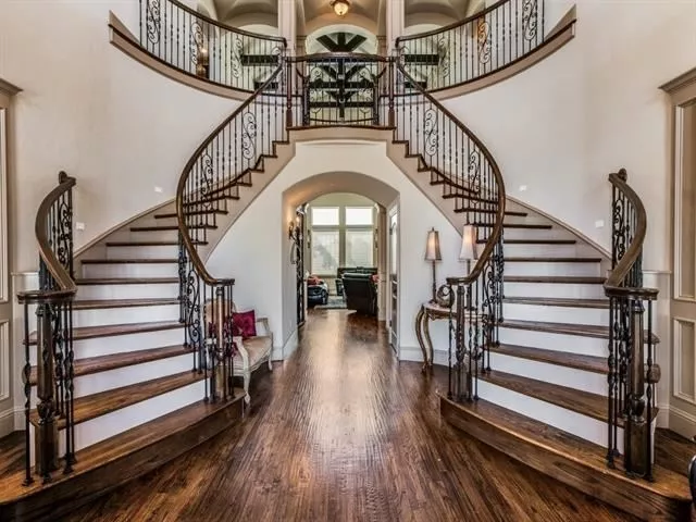 double curved staircase that ascends to the second floor, and is ornately decorated in wrought iron and wooden