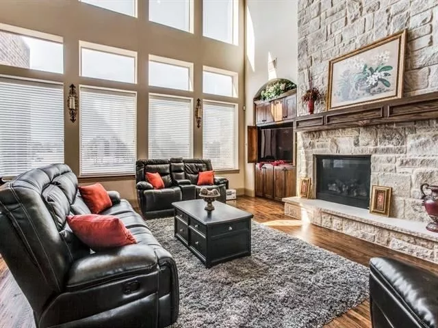 the expansive two-story great room with its dramatic and stunning fireplace of stone, a wall of windows, and