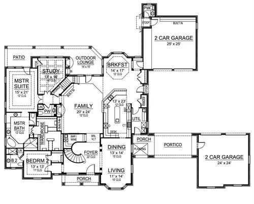 This luxury chateau mansion house plan offers varied ceiling treatments. The elegant two-story foyer includes a winding staircase to the second story, plus a wine bar, and a barrel vault ceiling. The foyer is open to the dining/living room beyond decorative pillars. The utility room, pantry and kitchen are in close proximity to the dining room for ease in serving, while the living room boasts a bay window. A family bedroom with walk-in closet and private bath sits quietly in the front off the foyer. The central gathering area consists of the kitchen, breakfast area and family room. The warming fireplace helps keep this area cozy.