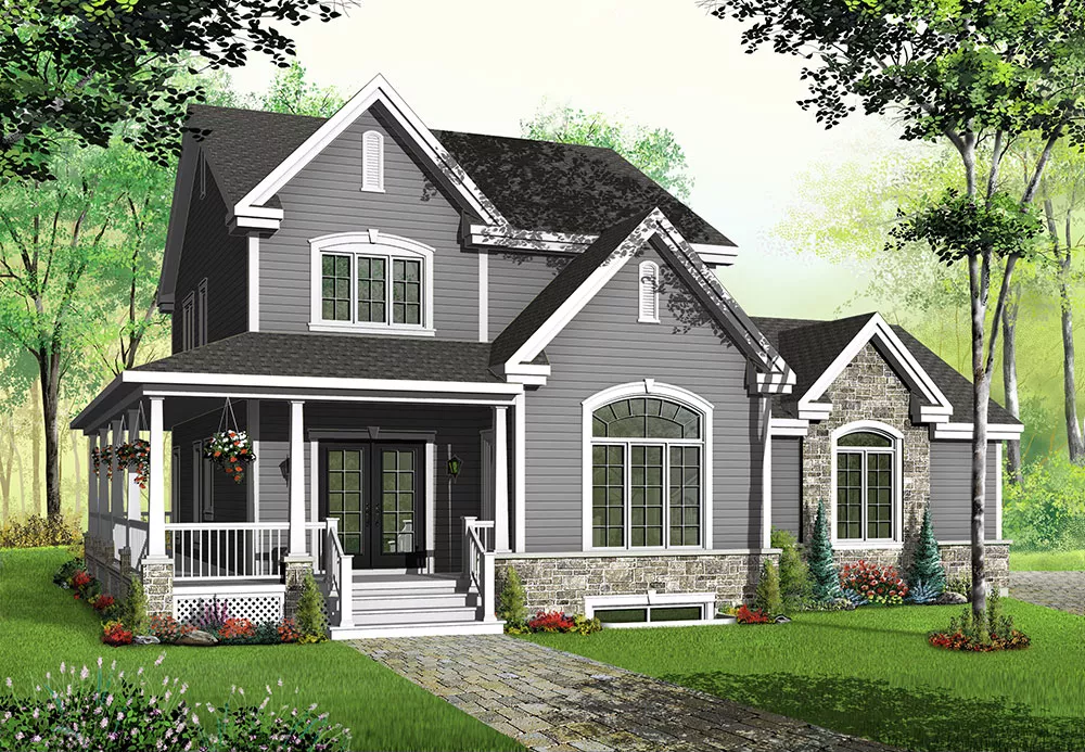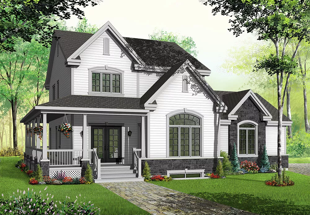 This classic three-bedroom cottage is sure to stand out in any neighborhood. Nine columns support a lovely porch that wraps around the left side of the home. Welcome guests in the spacious entry, and then direct them to the nearby powder room to freshen up. Relax in the great room, where a fireplace adds ambience. The family chef will love the gourmet kitchen, with its large island and handy pantry. Three bedrooms and two baths are located on the second level.