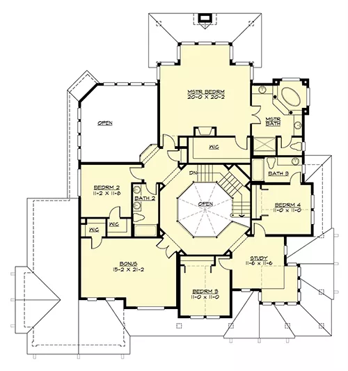 Tapered columns and decorative brackets are hallmarks of the Craftsman style of house plan. Beyond the wraparound porch, the welcoming foyer introduces a quiet den and the formal living room. The island kitchen serves any meal with ease. Whether you choose to relax in the spacious family room or on the breezy rear porch, a crackling fireplace awaits you. A winding staircase leads up from a central rotunda to the upper floor. The master suite is certainly dreamy! Check out its bright sitting area. The study is also bright, set into a striking tower. A sizable bonus room can be anything you wish; how about an art studio?