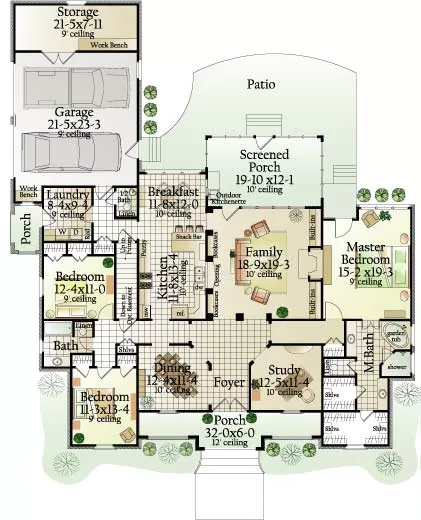 A grand entry takes guests and friends into the cozy great room. Built-ins frame the fireplace in the great room while a large screened porch adds the perfect spot for entertaining. The kitchen is spacious and includes a snack bar for additional seating. The charming arched opening in the kitchen keeps the cook close to family and friends. An additional 732 square feet is available for expansion.