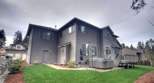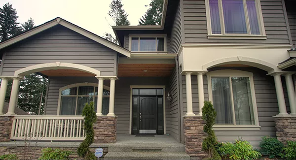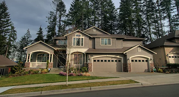 The graceful arched gables and traditional craftsman trim details create a delightful composition.