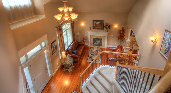 The dramatic double-height foyer beautifully displays the unique angled stair, while efficient circulation allows for generously sized rooms, including the oversize island kitchen, nook and family room. The grand master suite offers an octagonal sitting area, large walk-in closet, and a spacious master bath. A guest bedroom with ensuite bath and two additional bedrooms with a jack-and-jill bath complete the upper floor.