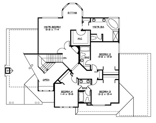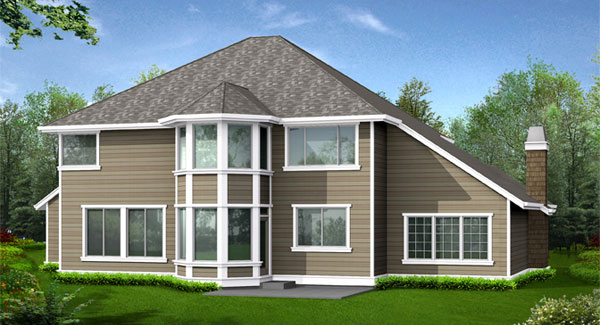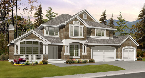 Terrific curb appeal combined with a family-friendly floor plan make the Trillium Lane one of the designers most popular plans. The graceful arched gables and traditional craftsman trim details create a delightful composition. The dramatic double-height foyer beautifully displays the unique angled stair, while efficient circulation allows for generously sized rooms, including the oversize island kitchen, nook and family room. The grand master suite offers an octagonal sitting area, large walk-in closet, and a spacious master bath. A guest bedroom with ensuite bath and two additional bedrooms with a Jack-and-Jill bath complete the upper floor.