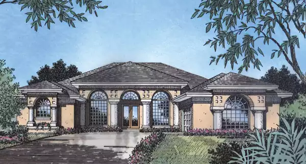 Enjoy the 12-foot columned entrance as you walk through the front door of this fabulous one-story house plan. Look up when you enter the home to see a tray ceiling, which is indicative of the detail throughout this beautiful home. Directly ahead is the large living room with stacking sliding glass doors leading onto a covered patio, perfect for entertaining. To the right of the foyer, through an arched opening, you will find the formal dining room. Enjoy cooking gourmet meals in your phenomenal kitchen, complete with island and prep sink, walk-in pantry and menu desk. The breakfast nook and family room with wood-burning fireplace are just off the kitchen, but tucked back into the corner of the house. Two secondary bedrooms with shared bath are good-sized and perfect for the children. A split plan allows for the master suite and den/Bedroom 4 to be on the other side of the home. Luxury abounds in the master suite, with French doors leading to the covered patio. The private bath features a double vanity, private water closet, large shower, garden tub and huge walk-in closet. The shoe-lover of the family will have plenty of space.