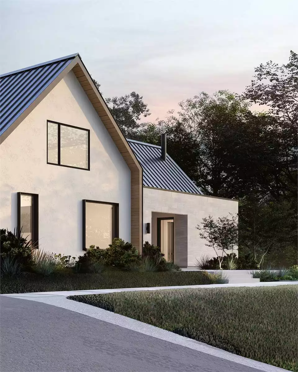 Discover a contemporary four bedroom home that blends sleek, Scandinavian-inspired aesthetics with functional elegance, spanning 3,608 square feet of comfortable living space. This design features an open floor plan that unites a vaulted great room and dining area with an island kitchen, where a double-sink overlooks the covered patio through a picturesque window. An office space, thoughtfully positioned to capture views of the front, offers an ideal setting for working from home. The primary suite claims a private corner on the left side of the house, ensuring a tranquil retreat. Upstairs, three additional bedrooms and a versatile flex space accommodate both rest and activities.