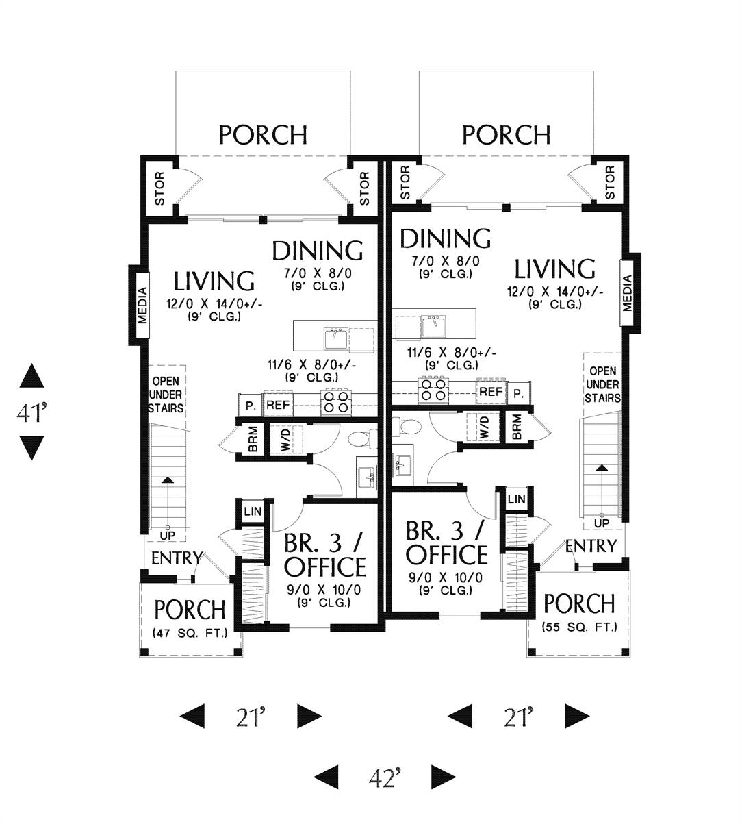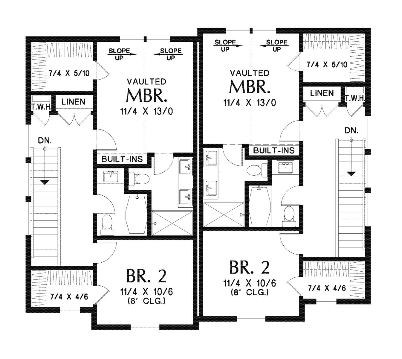 If you need a farmhouse-inspired duplex that doesn't skimp on space, give House Plan 6656 your consideration. Each side-by-side unit has 1,272 square feet with 3 bedrooms and 2.5 bathrooms--the perfect size for most families! Step inside and you'll find the office/third bedroom in front along with the powder room with stacked laundry. The open living space in back is anchored by a peninsula kitchen in one corner. There are patio doors beside the living and dining areas to seamlessly blend indoor and outdoor spaces. And check out the two attached storage closets on the porch for stowing away toys and tools! Head upstairs to see the vaulted master suite with its own walk-in closet, built-ins, and four-piece bath. The final bedroom also has its own walk-in closet and access to the nearby hall bath. While offset slightly, the units of House Plan 6656 are mirror images of each other, and they're designed to keep costs down thanks to the compact shape and grouped plumbing. This is a great duplex for a budget!