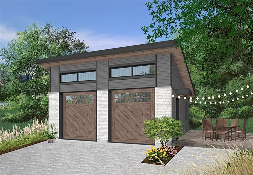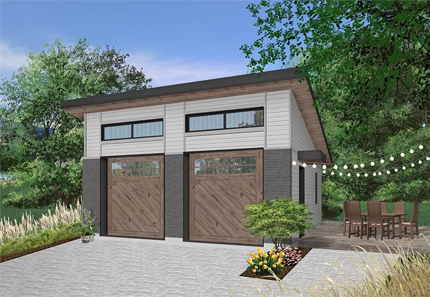 This two-car garage, contemporary style, has natural light coming from the large window on top of the garage door, the windows on the side elevations. Practical access through side door.