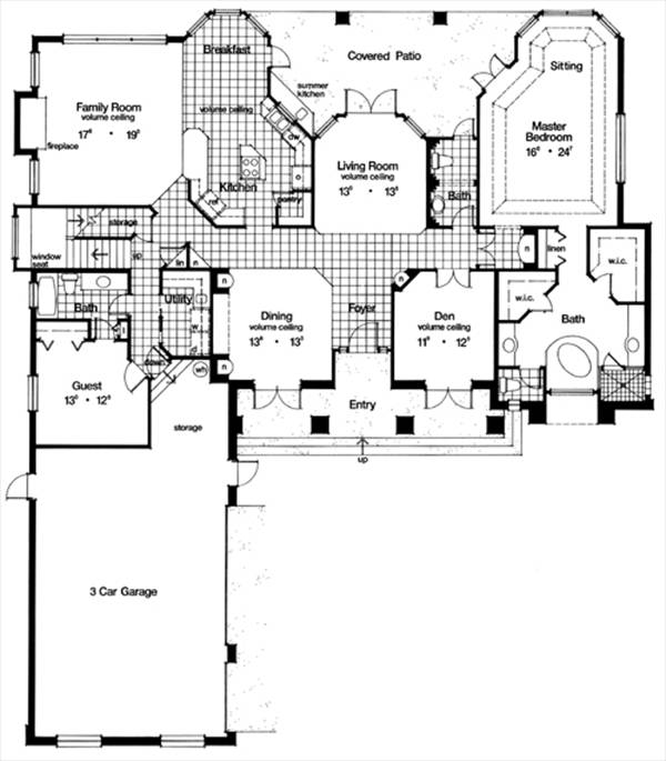 The family wing brings the gourmet island kitchen, bayed breakfast nook and family room together. All share views through walls of glass. Note the pass-thru over the kitchen sinks to the patio.