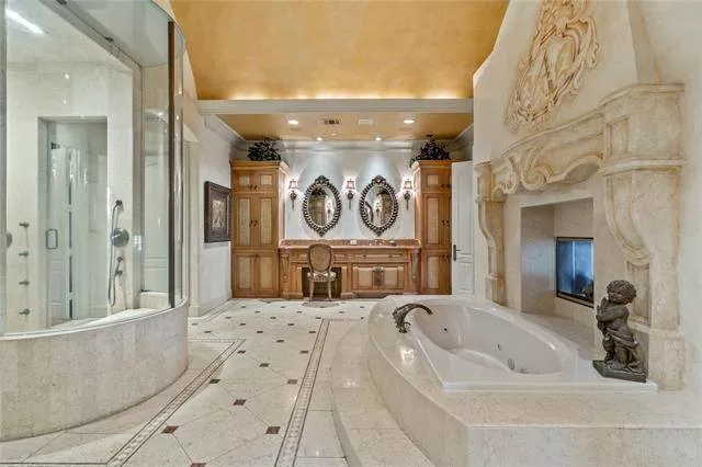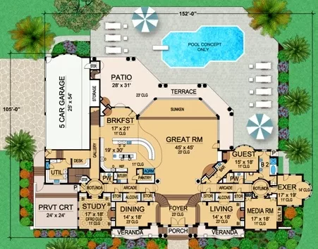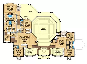 This magnificent Mediterranean luxury mansion house plan is stunning. Balconies, rotundas, large decorative pillars, and stunning ceiling treatments will draw you in. When you enter the two-story foyer, the double curved staircases will greet you. A few steps down to the right will place you in the living room with its fireplace flanked by built-ins. There is a veranda to the front of the living room and the alcove to the rear that leads to the arcade. Through the rotunda, you can reach the exercise room with circular windows and access to the lush landscaped yard. Between the exercise and living rooms is the media room with bar, closet and built-ins. At the back of this cluster is a guest room with bayed windows, private bar, and full lavish bath with his and hers vanities, walk-in closet, separate shower and tub. The large sunken great room with its 23 foot ceiling provides access to and views of the terrace. The family gathering area consists of the kitchen, breakfast area and great room. The great room's warming fireplace helps keep this area cozy. The gourmet kitchen provides a free-standing island for additional counter space, with a breakfast bar that can be shared with the great room and breakfast area. The breakfast area also offers a warming fireplace and access to the terrace. An aquarium sits between the kitchen and great room. To the left of the foyer and in the front of this house plan, is the formal dining room with the veranda to the front and the alcove to the rear, through the alcove to the left is the rotunda that leads to the quiet coffered ceiling study with built-ins, built-ins, built-ins - and a warming fireplace. A private court sits outside the study. A utility room with built-in desk, galleys, plenty of storage spaces, a five-car side-entry garage, and spiral staircase that goes to the master suite's second story balcony complete this main level.. On the second level of this luxury mansion house plan, four family bedrooms with walk-in closets, full baths, and balconies, share space with a den, game room with built-ins and a bar, and the luxurious master suite. The luxurious master suite boasts a bayed window, trey ceiling, lavish master bath with barrel vaulted ceiling, his and hers vanities, separate shower, whirlpool, and large wardrobe with mirror, built-ins, storage and a utility room. This completes this luxury mansion house plan.