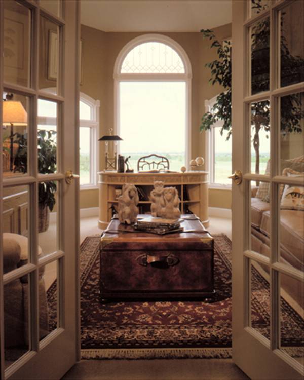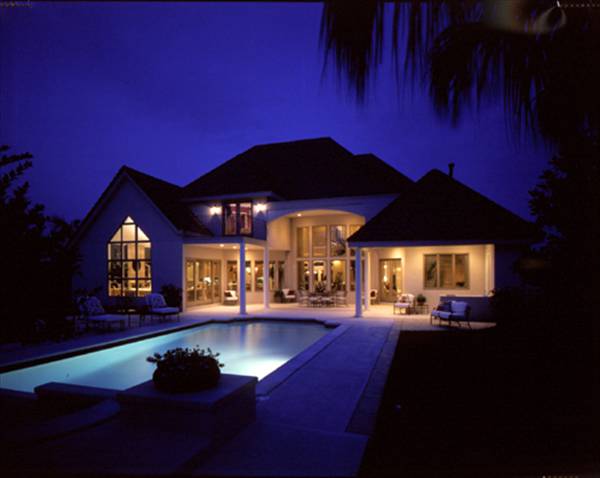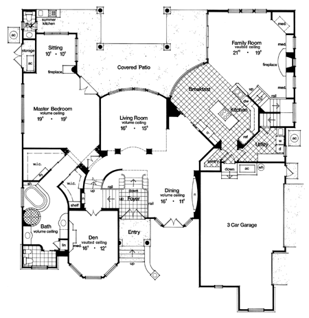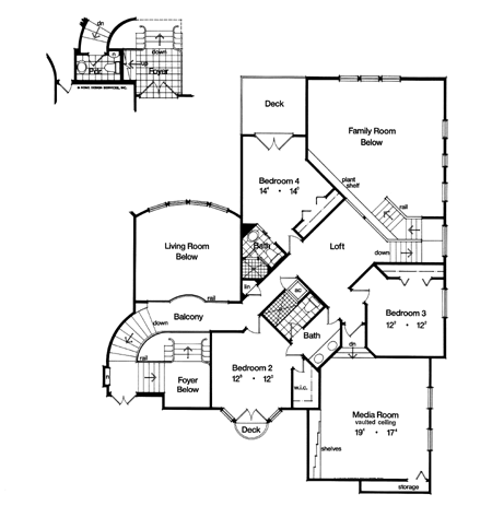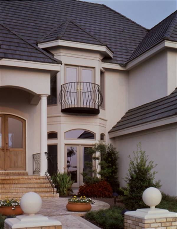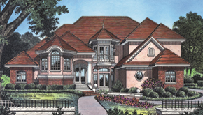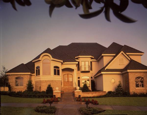 From its classic country french facade and its multi-level floor plan, to its intricate interior architecture, this magnificent home is destined to be a best seller. Not many designs can compare with this one of a kind plan. You enter the raised foyer and gaze through two story windows in the living room and look up to see the bridge to the second floor bedroom wing. Look right and you have a commanding view of the formal dining room with its built in server and coffered ceiling. Look left and a half staircase leads to a landing, where niche markes the doubled door entry to the library at mid-level, then ascends further to the second floor. Descending a few steps to the main level of this home brings you into the formal living spaces where the living room has a gently curved wall of the windows and its two story ceiling is coffered in box pattern. Just to the left of the living room and around the corner is another series of stairs which lead to a delightful and secluded powder room with a thoughtful niche beside the toilet. Double doors lead to the master suite's columned entry. The sleeping and sitting areas are brought together with a three sided gas fireplace. Generously sized walk-in closets precede the entrance to the lavish master bath. Rounded corners of the tub setting, as well as the circular shower, are mirrored in the ceiling above, creating a free flowing effect. Matching vanities and a private toilet/bidet chamber complete the design. The family wing of this home is also dramatic, with vaulted ceiling in the family room and pyramid type window cluster, viewing the rear yard. The media and fireplace wall is segmented with niches, window portals and plant shelves. Overlooking both the family room and curved wall of the breakfast area, the island country kitchen is a gourmet's dream, with ample cabinets and a large walk-in pantry. The utility room has added storage space with a door under the secondary stair to the second floor. This dual stair design is convenient for a day to day living, and especially nice when guests are being entertained in the formal part of the home. The second floor has a loft overlooking the family room below while the two front bedrooms share a private bath. The rear bedroom has the advantage of a sun deck and its own private bath. The bonus room is perfect for a home theater or game area, with ample storage and built-in shelving. This grand award winner has everything the today's family would want, with a beautiful country french elevation that is both elegant and inviting.