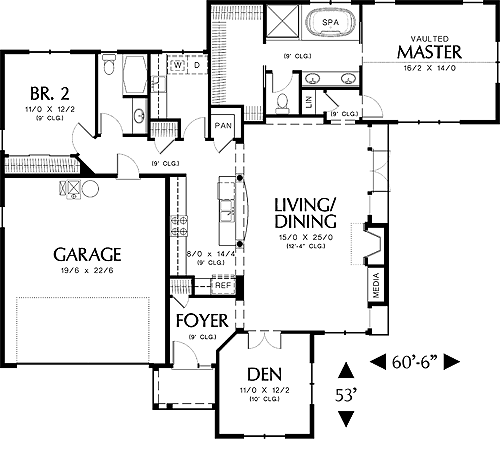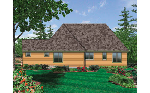 Bedrooms are separated for privacy: the master suite is behind the living/dining area; Bedroom 2 is behind the two-car garage. Special elements in the master suite: vaulted salon, spa tub, separate shower, dual lavatories and walk-in closet.