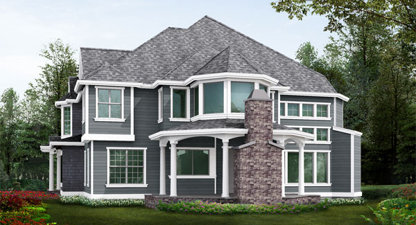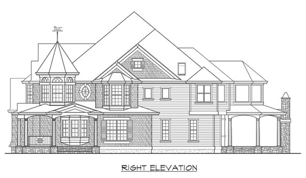 This popular plan makes a statement with its bold Victorian facade. A corner entry porch and steep-roofed turret begin a bold diagonal axis that orients visitors and residents alike, from the formal entry vestibule thru the octagonal stair rotunda with balcony overlook, ending at the dramatic 2-story family room fireplace. A spacious covered rear BBQ porch provides a setting for relaxed outdoor entertaining, while the formal living and dining rooms are perfect for holiday dinners and adult conversation. The grand upper floor master suite offers a romantic fireplace and a light-filled sitting area, plus a luxury bath highlighted by a raised soaking tub framed by turned columns. A guest bedroom with an ensuite bath, two additional secondary bedrooms, a compartmented hall bath, and an oversize bonus room with storage complete the upstairs.