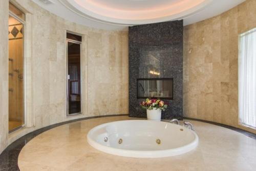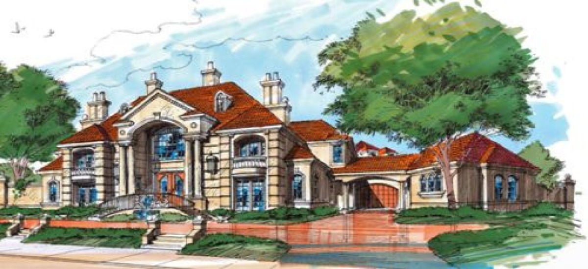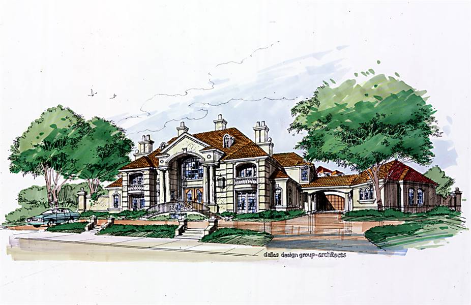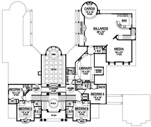 This opulent luxury mansion home plan offers varied ceiling treatments and two-story ceilings adding volume to your living spaces. Balconies, fireplaces and plenty of built-ins are just some of the amenities in this luxury home. The elegant two-story foyer is flanked by a private living room and quiet study with see-through fireplace to the left, and a formal dining room with corner fireplace to the right. The wine bar and butlery off the dining room provide ease in serving your family and guests those special dinners. Adjacent is the gallery that leads to the gourmet kitchen with breakfast bar and free-standing island for plenty of counter space for any chef. The breakfast area and family room share space on the opposite side of the breakfast bar, and feature built-ins and a fireplace that lends warmth to both rooms. The family room offers access to the veranda, storage and powder rooms. Family and friends will enjoy the game room with storage closet and access to the veranda. The rotunda-shaped bistro offer views of the lush landscape. Surrounded by steps up and down, the elegant two-story foyer delivers you into the stunning great room through large decorative pillars and beyond the built-in aquarium. The rear bank of windows in the great room's domed-ceiling rotunda allows for plenty of sunshine to brighten your day. Beyond the vestibule is the luxurious master suite with fireplace, sitting room with back yard view, a gym and lavish bath with his and hers vanities, separate shower, Roman tub and large wardrobe with built-ins. An elevator sits off the gallery next to the butlery. Beyond the utility room, pantry and side stop is the portico that leads to two two-car garages and storage. Upstairs, four family bedrooms with walk-in closets and full baths share space with reading lofts and alcoves, a library, game room with bar and card area, and media room. An overlook and loggia offer stunning views from above to the luxury mansion home below.