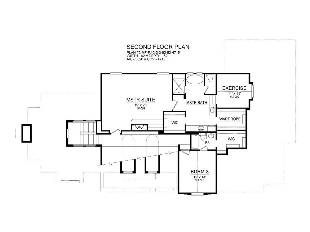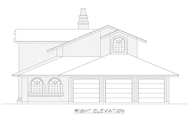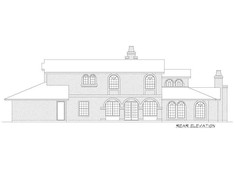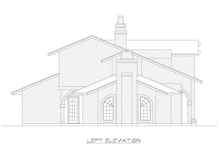 This luxury Mediterranean home plan offers a red tile roof, large chimney pots, arched windows, a two-story double transom window, stucco façade and a tall, grand entrance French door. The foyer opens immediately into the family room, complete with a wet bar and seating, the oversized windows allows for great views of the beautifully manicured back yard. A dramatic, private study with fireplace and vaulted ceiling has a sitting room or a quiet place to read to the left of the family room and foyer. Adjacent to the right of the foyer is the elegant dining room which seamlessly is separated by the kitchen’s eating bar. The gourmet kitchen offers a free-standing bar, a built-in booth, built-in modern, state-of-the-art appliances, granite counter tops, pantry, and a utility room. Behind the dining room and kitchen is a cozy bedroom with walk-in closet and full bath. This bedroom offers access to the outdoor patio. Off the family room, stairs rise to the second floor where a bedroom with vaulted ceiling is part of the two-story double transom and offers a large walk-in closet and full bath. The entire rear of the second-floor plan holds the master suite that boasts a fireplace, luxurious master bath with his and hers vanities, separate glass shower and marble tile tub, a walk-in closet and wardrobe with built-ins and a vaulted exercise room. A three-car, side entry garage with access to the back yard and the hall behind the dining and kitchen areas, completes this luxury Mediterranean house plan.