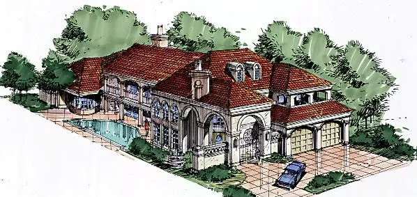 This luxury Tuscany villa home brings your dreams to your doorstep. As you enter the foyer, the openness of this plan is what you will experience. The living room provides a warming fireplace, while large decorative pillars define the perimeters of the living room and adjacent dining room. The bar can access the terrace to enjoy the outdoors. The family gathering area consists of the kitchen, breakfast area and family room. Flanked by built-ins, the family room's fireplace keeps this area cozy. The kitchen provides a free-standing island for additional counter space. The breakfast bar can be shared with the family room and breakfast area. The luxurious master suite boasts a bayed window sitting area, fireplace, tray ceiling, lavish master bath with his and hers sinks, separate shower, whirlpool tub, and large wardrobe. A circular staircase on the terrace goes to the second floor balcony. Upstairs, two bedrooms with walk-in closets, full baths and balcony access share space with a game room with bar and a media room with built-ins. Enjoy the views from above to the main level below.