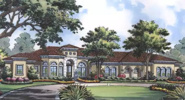 The Mediterranean 1 story has it all and then some. Upon entry into the raised foyer we view the bayed living room beyond with a ventless fireplace. To the right is the columned dining room and gallery with large niches and a wet bar. The gallery continues for access to the secondary bedrooms, laundry room and 3 car garage. Beyond the dining room / gallery is the family area of this home with a large island kitchen, dual space for refridgerators, dual space for ranges, a large walk-in pantry between the ref. whose entrance could be consealed by the cabinetry matching the ref. doors. Large nook area will accomodate a family size table and chair layout. The family room has large sliding glass corner doors that when open make the covered patio and family room feel as one large entertainment area. Thru the double doors off the family room is the Theatre with its split level foor to accomodate theatre seating layouts. Bedroom 4 also off of the family room is like a second master suite with its lavish bath layout containing all the amenities of a full master bath.