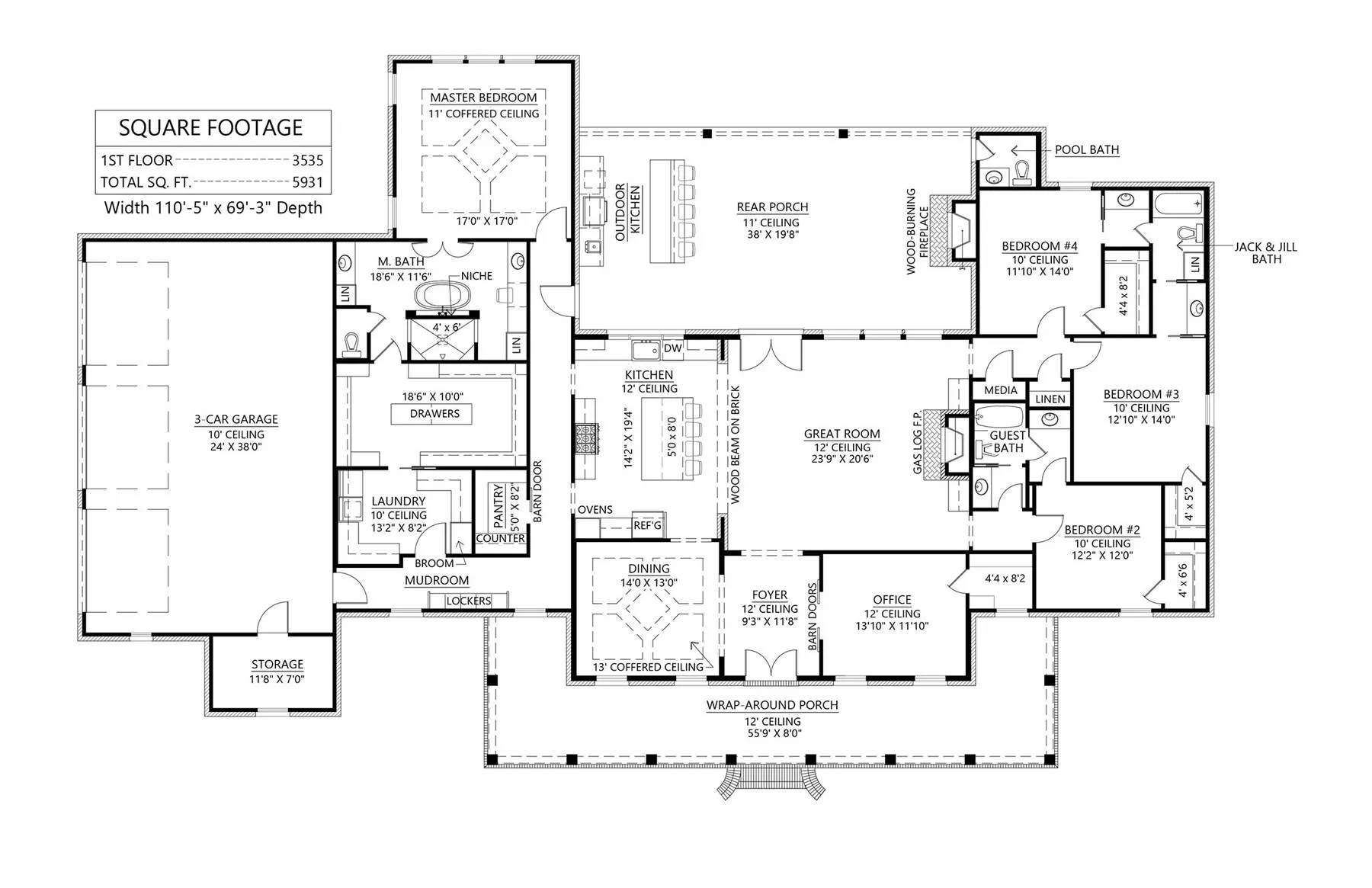 Country living just got better. From coffered ceilings to the outdoor kitchen, this home is perfect for any family who enjoys Southern-style but wants modern features too. This 4-bedroom open-living plan includes two massive, covered porches. The front wrap-around porch is over 55’ long with plenty of space to sit down and relax, while the rear covered porch has a fully equipped outdoor kitchen, a wood-burning fireplace, and even a pool bath. Next to the foyer we have the dining room with gorgeous, coffered ceilings. Through the barn doors we find the home office with its own closet. The plan opens to the Great room with a gas log fireplace and an open view into the kitchen. Boasting a large kitchen island, this U-shaped kitchen has plenty of counter space and room for gourmet appliances. Steps away is the walk-in pantry that also features a counter space. Coffered ceilings are also found in the master bedroom with plenty of windows to let in the light. The master bathroom has two vanities, separate tub and shower, a bathroom stall and a linen closet. The spacious walk-in closet features drawers in the middle island. The 3 other bedrooms are on the other side of the plan, two of them sharing a jack-and-jill bathroom. The 3-car garage with storage space connects to the mudroom, where we find the laundry room. If you’re looking for comfortable country living, this is the plan for you.