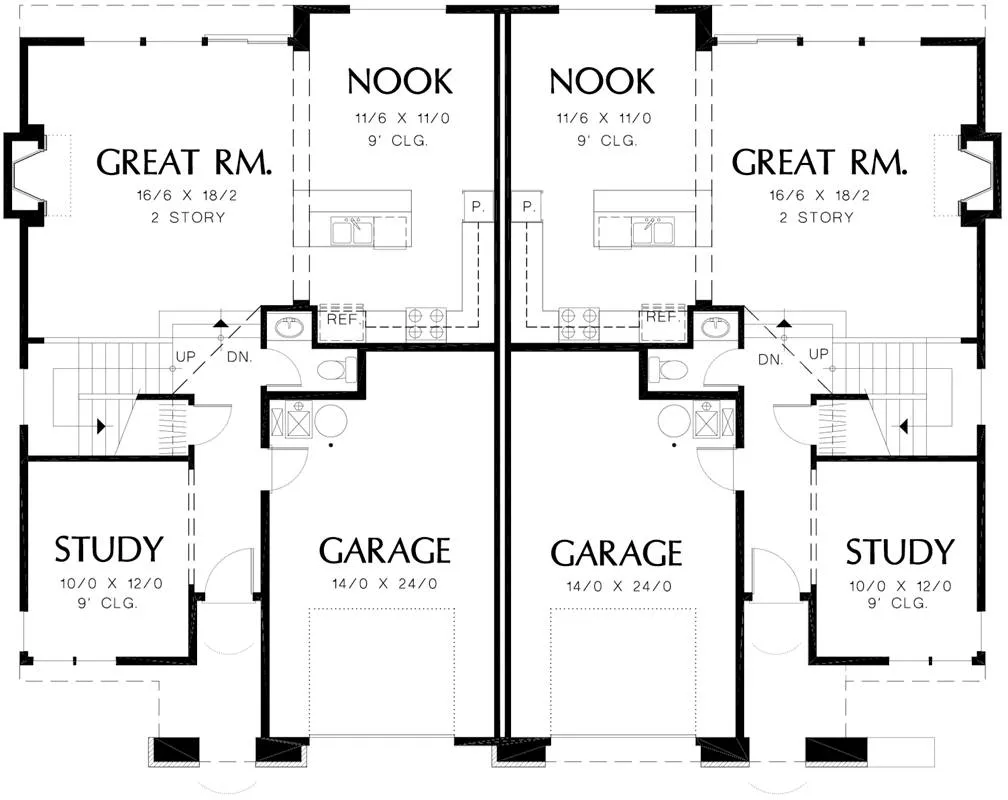 Born from architectural elements of English country and Tudor design, this stunning duplex contains gracious living spaces. The two units are mirror-imaged and begin with a recessed entry set back alongside a one-car garage. A study with nine-foot ceiling opens directly off the entry hall, which has a coat closet and half-bath. Step down just a few steps to the two-story great room with fireplace and sliding glass doors to the backyard. An island kitchen and nook with nine-foot ceiling are nearby. Bedrooms and a laundry alcove are on the upper level. The master suite has a tray ceiling, a walk-in closet and a full bath with twin lavatories. Bedrooms 2 and 3 share a full bath.
