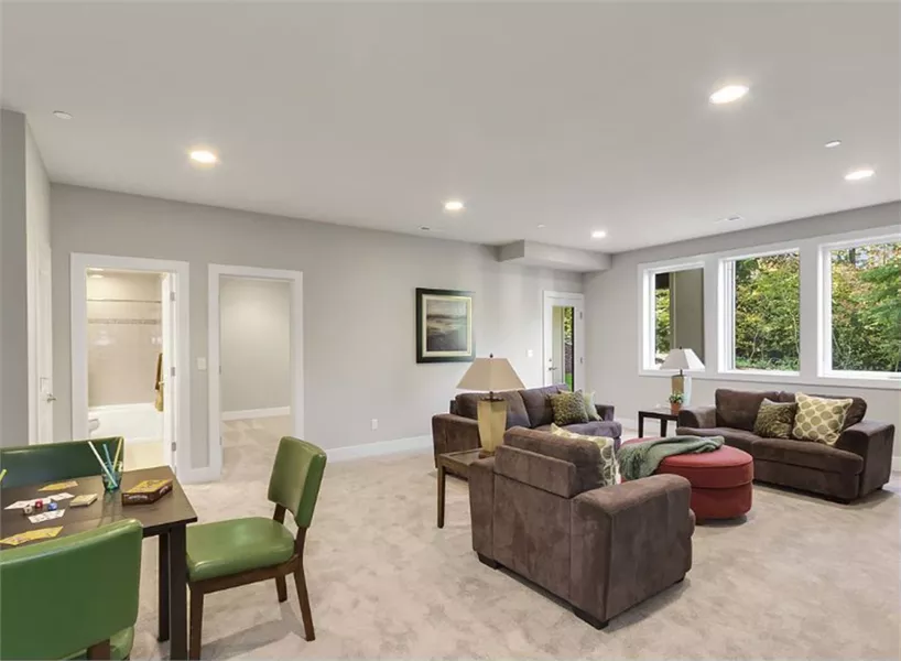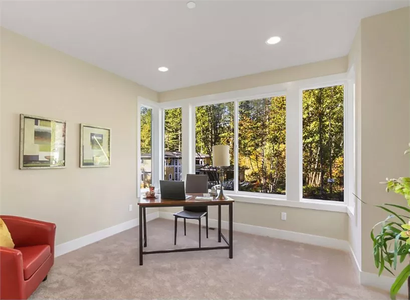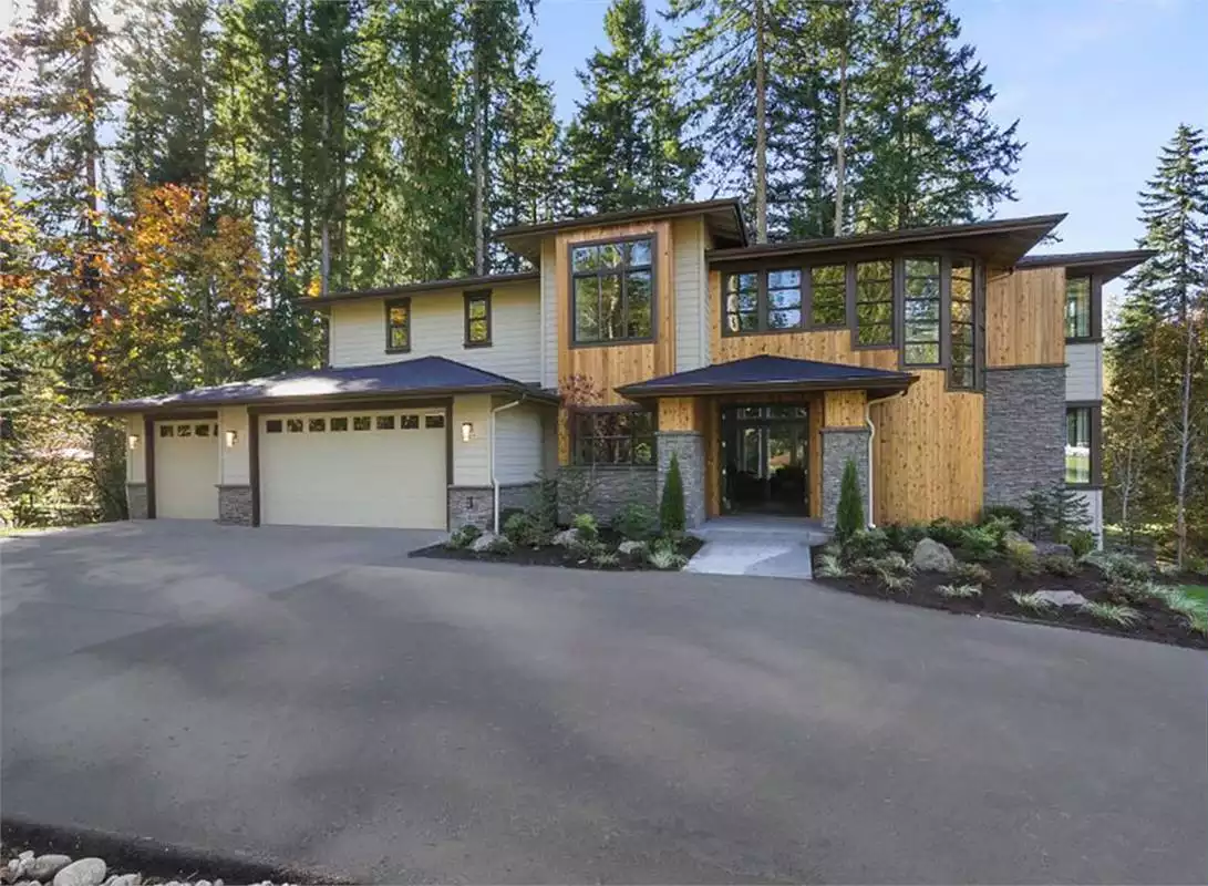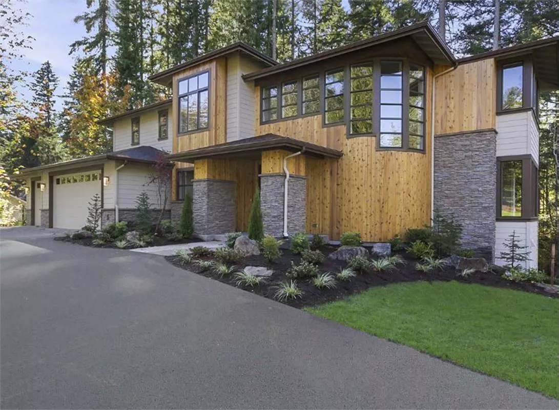 Stone accents and natural wood combine with interesting windows to give this five-bedroom house plan a contemporary look, with a total of 3,771 square feet on three levels. A fireplace enhances the dramatic great room in this luxury home plan, with its high ceiling and jaw-dropping wall of windows. The island kitchen serves the bright dining room with grace. A cozy den and a breezy covered deck round out the main level of this home design. Another covered deck is found off the master bedroom on the upper level. The personal bath boasts a corner garden tub, a separate shower, two vanities and a walk-in closet. Two secondary bedrooms on this level straddle a bridge overlook. Two more bedrooms are located in the daylight basement, where a fun recreation room boasts a fireplace and wine storage, and opens to a covered patio. Builders point out the three-car garage, which opens to a bright laundry/mudroom.