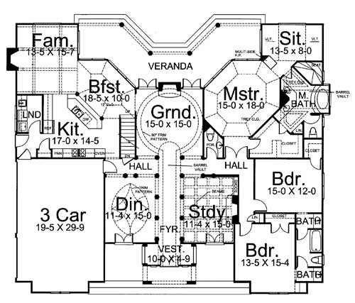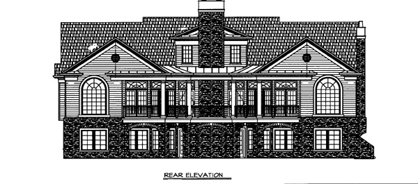 The facade of this Colonial home offers classical accents and striking symmetry. A vestibule welcomes you inside to a foyer flanked by an impressive study and a formal dining room. Straight ahead, the grand room is warmed by a fireplace and provides double sets of French doors accessing the rear veranda. The left side of the home is a casual gathering area for the family, which includes a snack-bar kitchen, a breakfast room and the family room warmed by another fireplace. A laundry room and three-car garage are easily accessed from the kitchen. Family sleeping quarters reside to the right of the plan. The master suite is pampering with a double walk-in closet, master bath and sitting room. Two additional family bedrooms share a Jack-and-Jill bath. A home office with a third fireplace, a playroom, a full bath and walk-in closet storage reside upstairs.