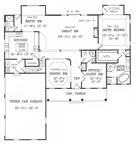 This comfortable 1-1/2 story design is designed for entertaining. I created an open flowing plan with excellent circulation, including a quiet location for the main floor master suite. Among the master suite's highlights are a sunny sitting area, tray ceiling, huge walk-in closet and a corner spa tub in the bath.