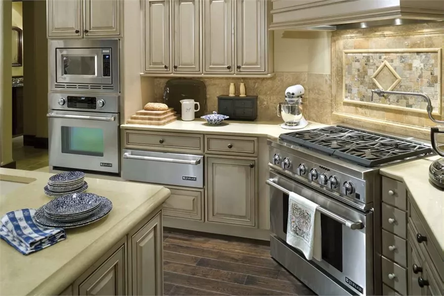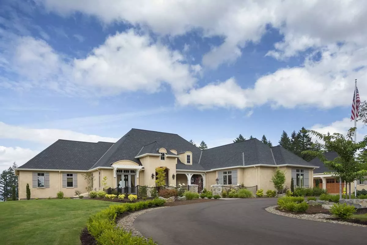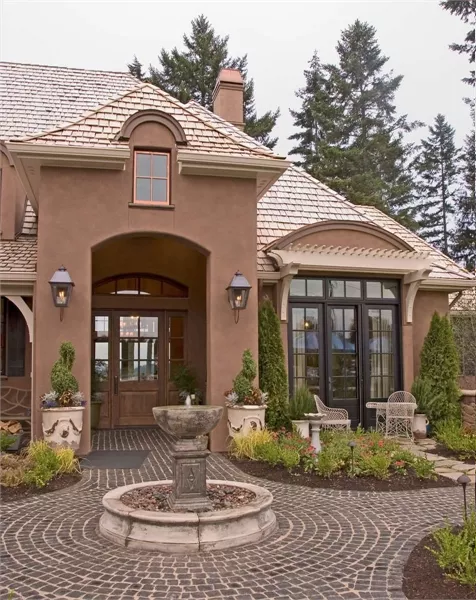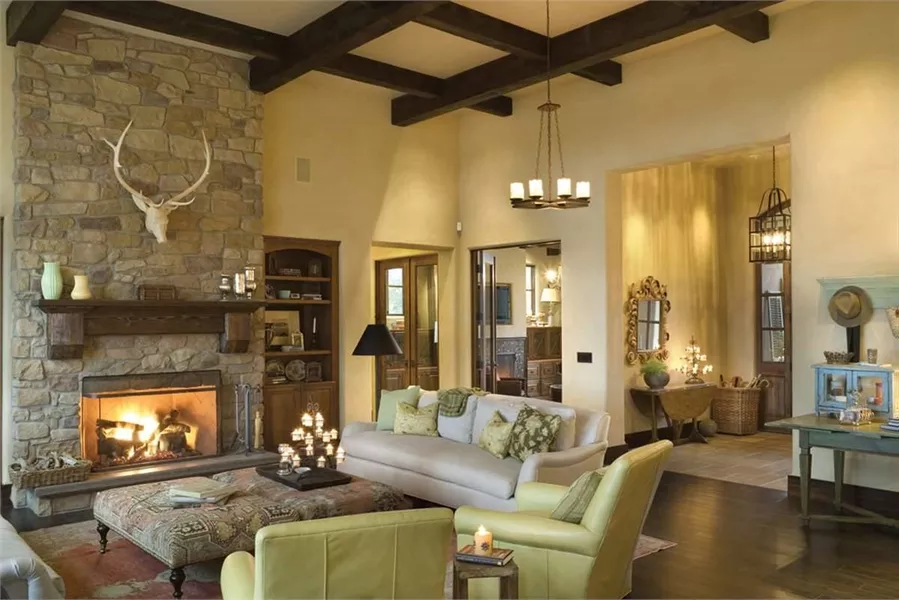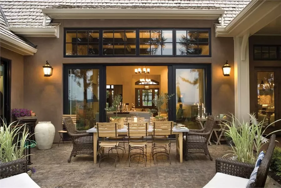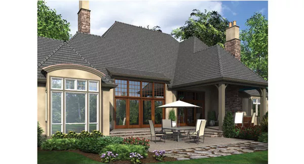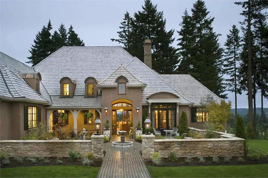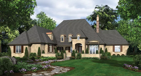 This spacious home features a French country faade. Inside, a front-facing den would make a great home office. The vaulted Great Room is dramatic enough to impress your visitors. The kitchen and dining room flow into a special outdoor living area, complete with a fireplace and a barbecue grill. A sunken tub anchors the opulent bath in the master suite. The upper floor nicely accommodates guests or hobbies. The home measures 4,352 square feet, and qualifies as one of our best-selling house plans.