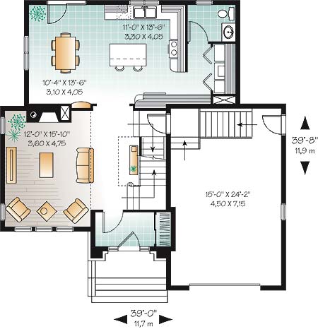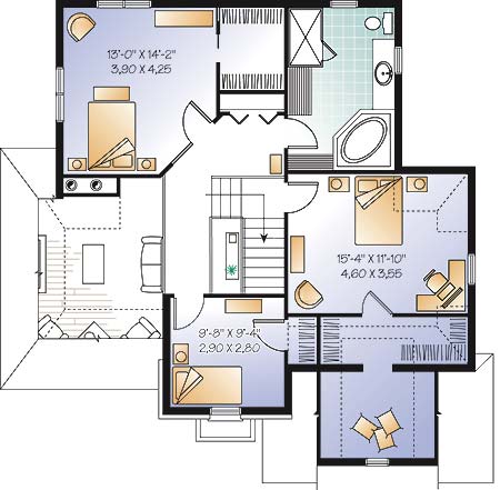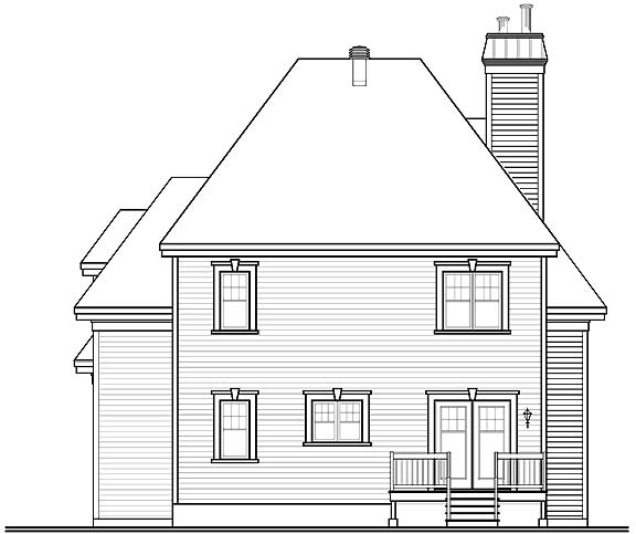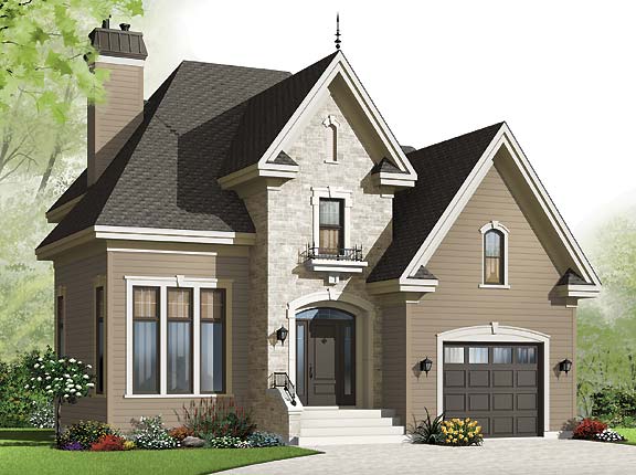 This two-story home plan boasts graceful lines and a European feel. Beyond the air-lock entry, the vaulted living room hosts guests in style. A fireplace adds ambience. The kitchen's island includes a snack bar for two. The versatile dining room offers French doors to the backyard. On the upper floor, the master bedroom holds a big surprise---a secret room for relaxing or reading.