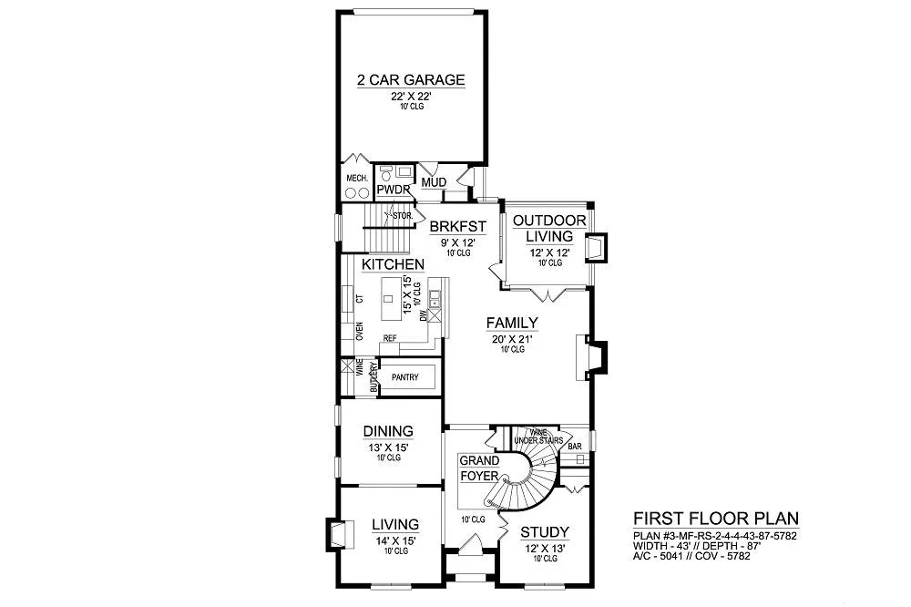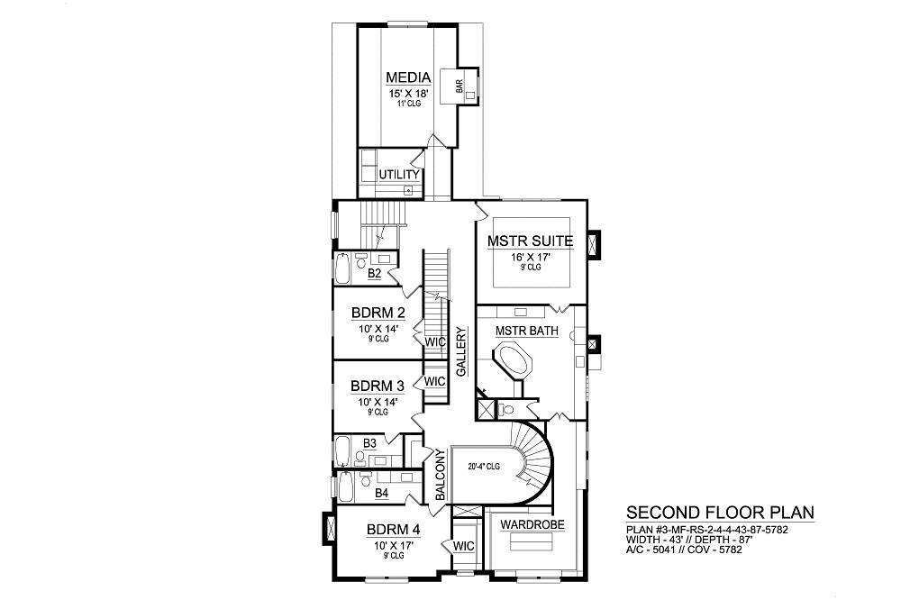 This traditional, contemporary, luxury house plan is narrow with large rooms and lacking nothing. A large coach light above the arched covered entrance adds ambiance. Entering the two-story grand foyer, your eyes are immediately drawn to the circular staircase leading to the second floor of this stylish family home. A wet bar and wine storage is nestled under the staircase. A quiet study with large walk-in closet sits off the grand foyer to the right, while the living and dining rooms sit openly to the left. A built-in fireplace in the living room adds to the ambiance of this extraordinary floor plan. For ease in serving family and guests, access to the wine room, butler pantry, and kitchen is achieved through the entryway off the dining room. The gourmet kitchen boasts a 17’ ceiling, built-ins, a free-standing island, eating bar,and plenty of counter space for any chef. A breakfast room and family room adjacent to the kitchen offer access to the outdoor living space. Fireplaces accent the family room and outdoor living space, adding to the warmth of these areas. Behind the breakfast room is a powder room, as well as a mud room that leads to the two-car, rear entry garage with mechanical room. Upstairs, two family bedrooms share a Jack and Jill bath, both with walk-in closets, and down the gallery, a third family bedroom has a walk-in closet and access to a full bath. At the rear of the house plan is a utility room and a vaulted media room with wet bar. The master suite wit trey ceiling boasts a luxurious master bath with his and hers vanities, corner shower, centered garden tub, and large wardrobe with built-ins.  Down the gallery, a balcony offers views to the first floor below, completing this luxury traditional contemporary house plan.