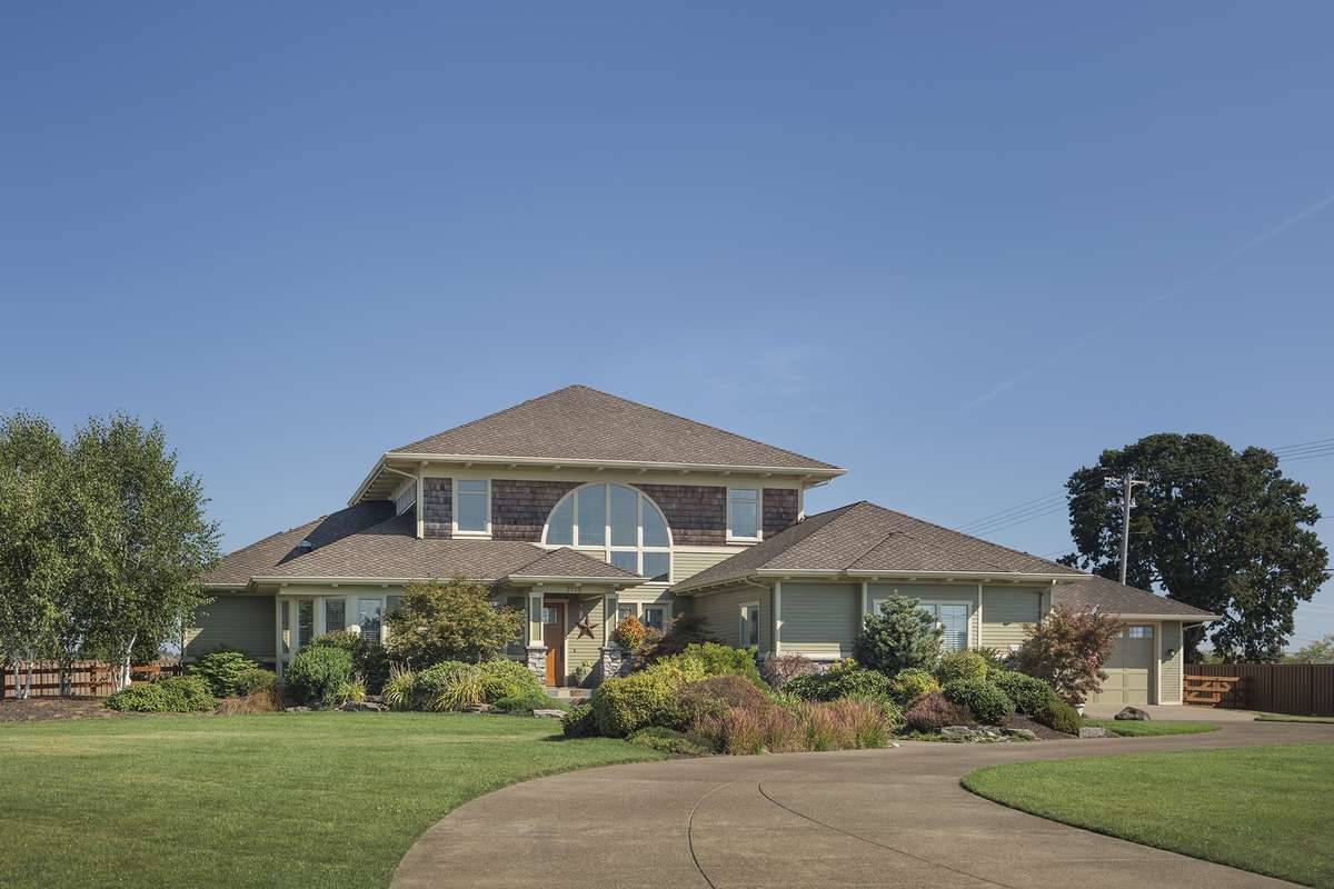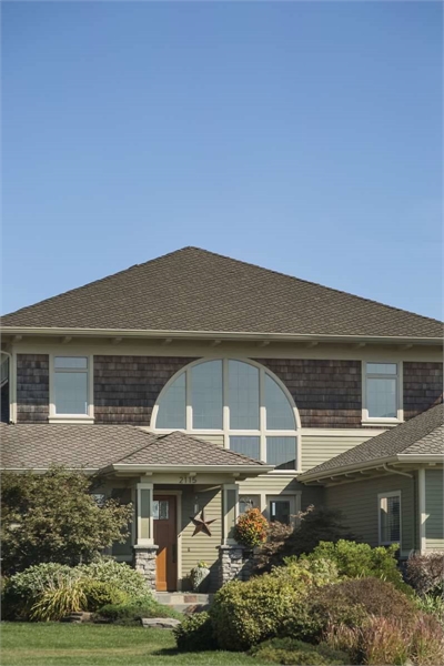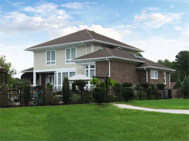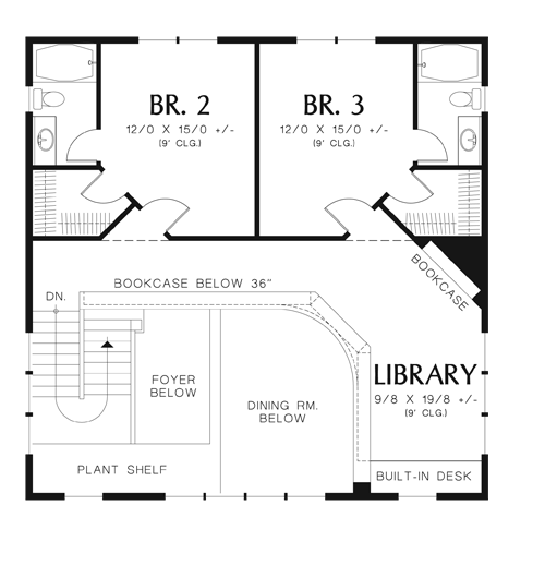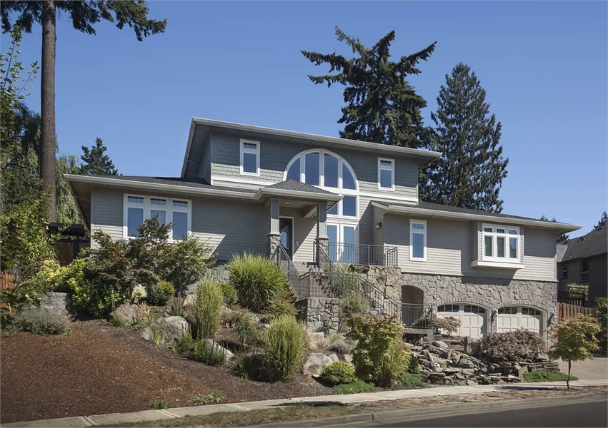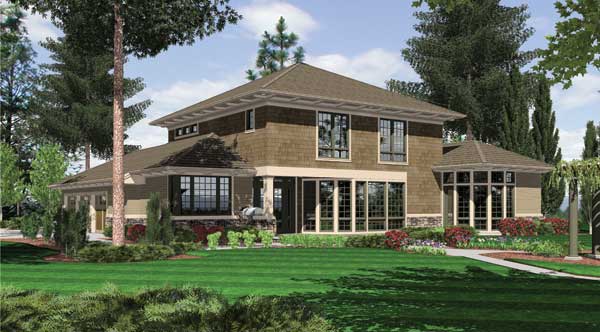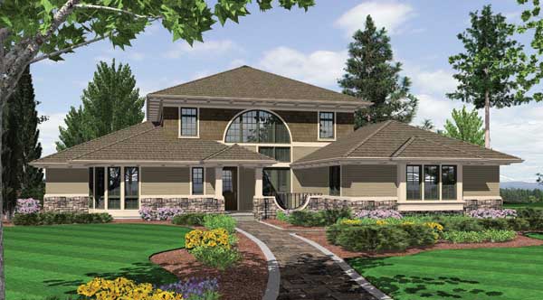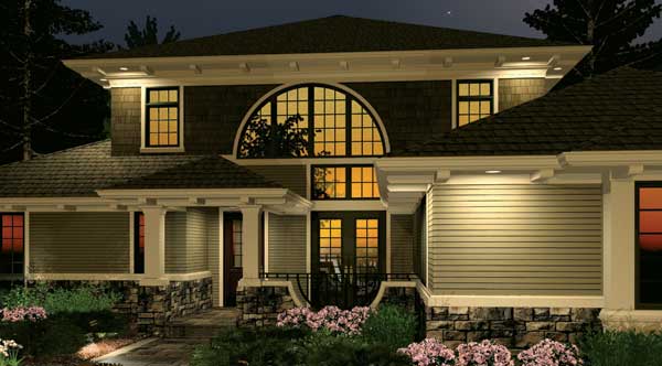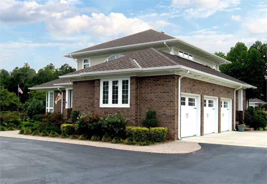Two family bedrooms share the upper level with a library with built-ins. Each upper-level bedroom has its own bath and walk-in closet. Note the three-car garage and the use of art glass in this design.