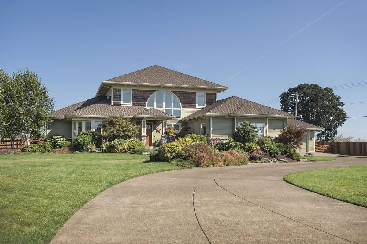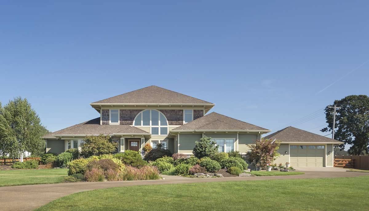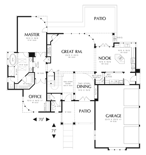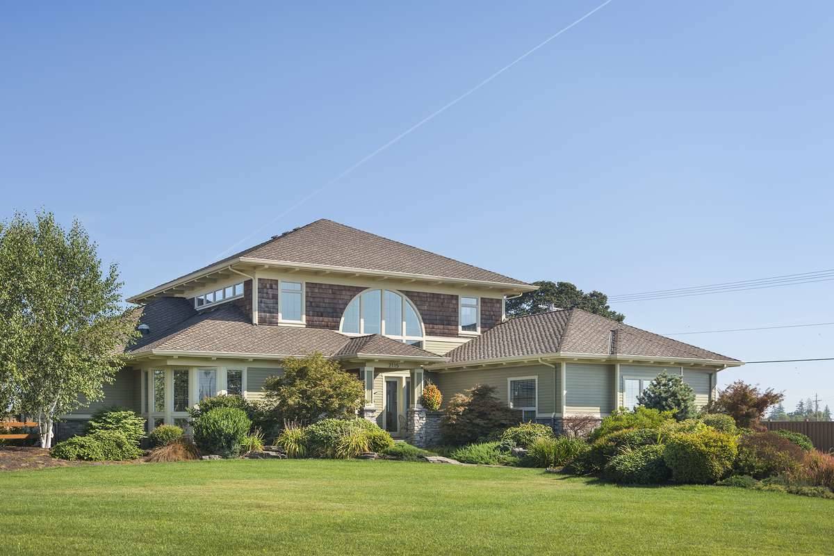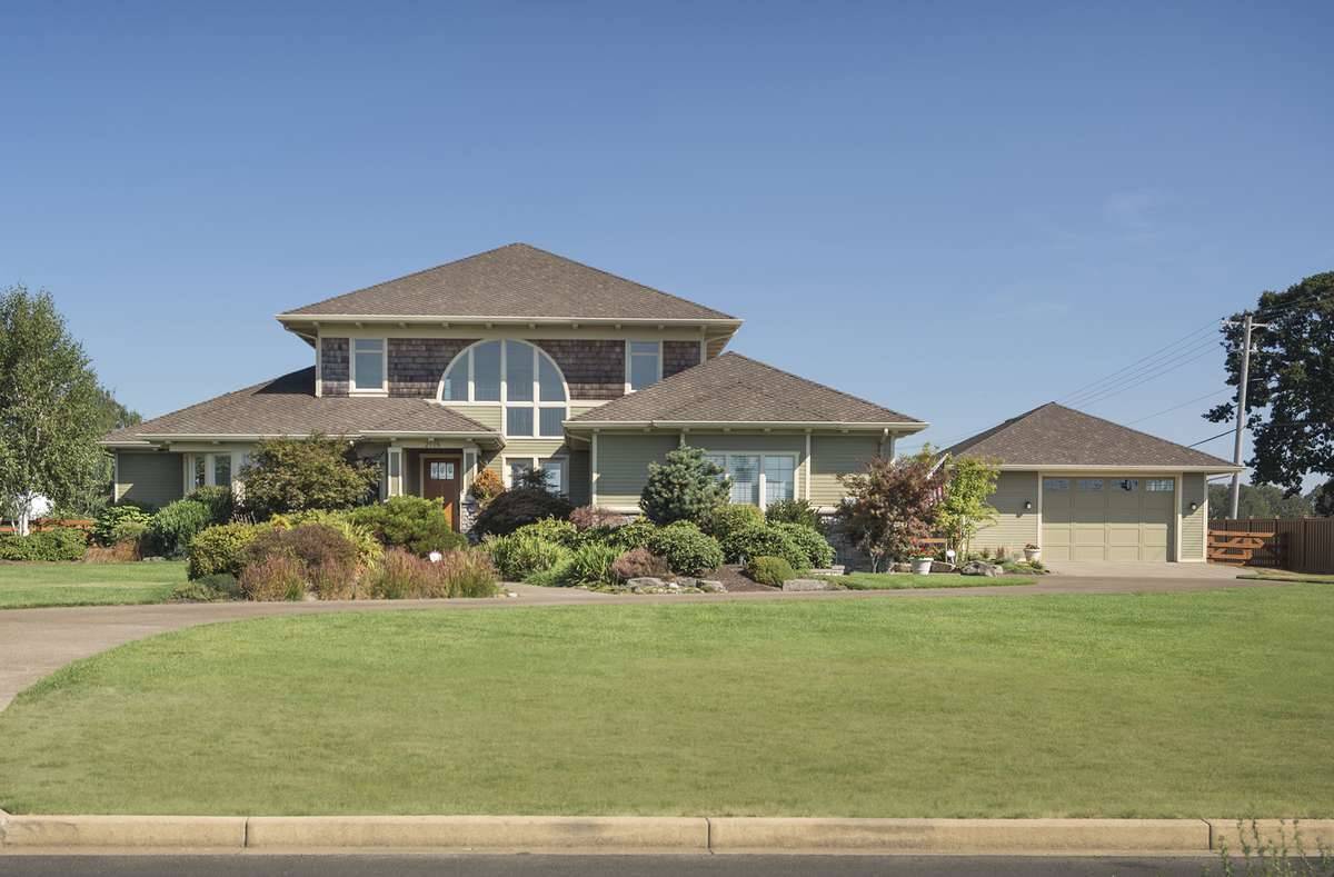 Two family bedrooms share the upper level with a library with built-ins. Each upper-level bedroom has its own bath and walk-in closet. Note the three-car garage and the use of art glass in this design.