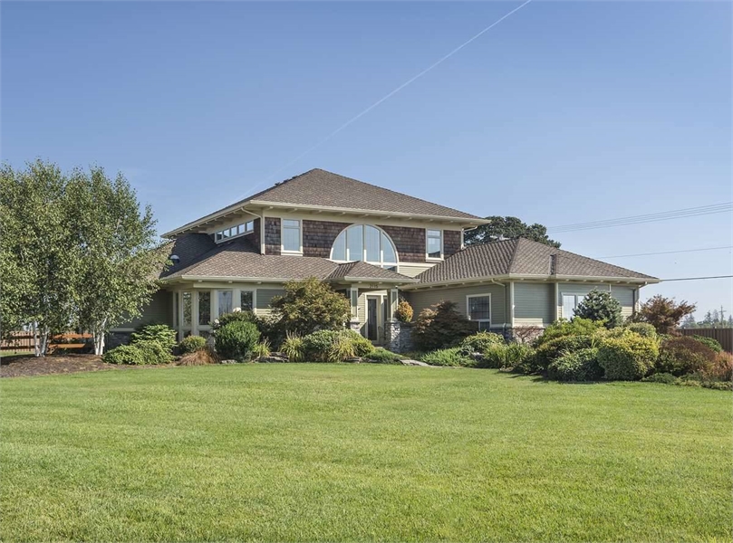 The left wing of the main level contains a home office with curved window wall and the master suite, which has a salon with curved window wall and bath with spa tub and walk-in closet.
