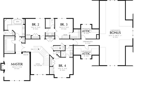 The upper-level provides three bedrooms for siblings and guests and well as a suite for parents. Double doors and a hallway announce the private zones of the master bedroom and bath. Features include a spa tub, walk-in shower, and fireplace. Each of the other bedrooms has a built-in desk. Two attic areas plus a bonus room will ensure the home provides space for storage.