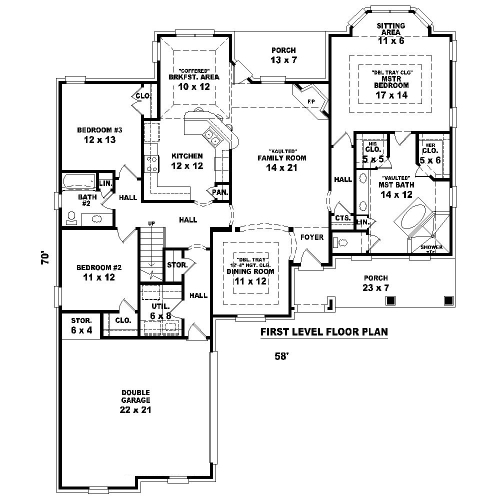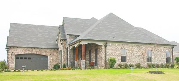 Natural stone and graceful arches adorn this charming design. Just beyond the sheltered porch lies the foyer to a large vaulted family room with corner fireplace and view of the generous back porch beyond. The dining room features a stately window and double-tray ceiling, which can be seen through arched openings to the foyer and to the family room. The master suite is amazing with the sitting area in a multi-windowed bay and the double-entry shower behind the oval spa tub. Another double tray ceiling is over the sleeping area while the bath is vaulted. The kitchen sink is on an angled snack bar overlooking the family room and window-filled breakfast room with coffered ceiling. There are three bedrooms and a recreation room that you may choose to finish now or in the future.