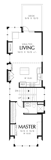 The main level upstairs holds a vaulted living room with built-in media center and L-shaped booth seating for dining, an island kitchen with double-door pantry and display shelves, and the master suite. Look for built-ins and a private bath in the master suite. An outdoor deck lies just beyond the living area. A cozy vaulted study loft on the loft floor is graced by a huge built-in bookshelf.