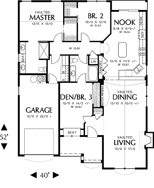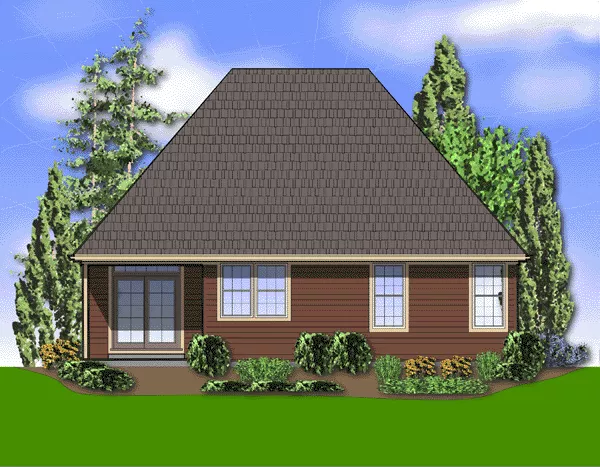 Surprises wait on the inside of this charming plantheres much more living space than may be immediately apparent. The magic is due, in part, to a hipped roof that allows room for vaulted living and dining rooms and nine-foot ceilings in the den and the bedrooms. Some exceptional details you wont want to miss include: a fireplace in the living room, a hutch recess in the dining room, an arched 42 counter separating the dining room from the kitchen, a large island in the kitchen, a built-in desk in the nook and sliding doors in the nook to a rear patio.