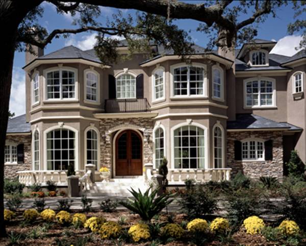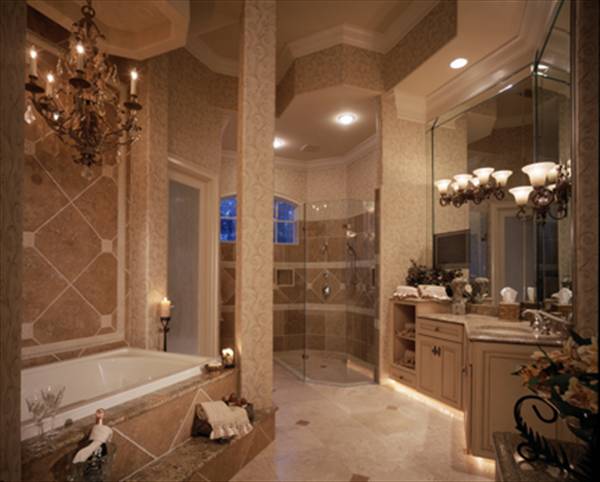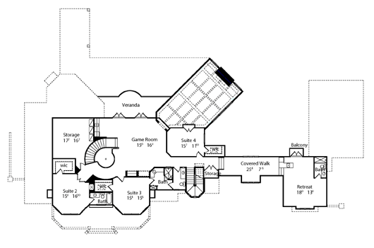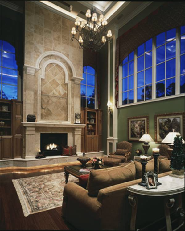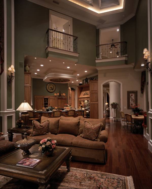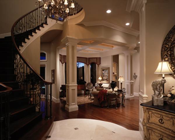 Two symmetrical turrets make this facade commanding, yet elegant. Visitors are greeted by a beautiful circular stair outlining a two-story rotunda covered with a lighted domed ceiling. Stepping down from the foyer, colums frame a panoramic view through the open living room to the pool area. Tucked to the left through private passage below the stairs is the spectacular master bedroom suite. The design of the room "wraps" itself around the pool area and offers views of the surrounding backyard amenities. The gracious master bathroom and closets provide ample room, and a "secret" exercize room, hidding behind the jacuzzi tub, makes the whole suite truly luxurious. The right wing of the home is perfect for entertaining with a large, open kitchen overlooking the two-story family room. Other special utility features are a hidden pantry and laundry room, a pet spa area and a covered porte cochere connected to private guest quarters. Upstairs also features an open game room area centered amongst the large bedroom suites and a home theatre with private walkway over the porte cochere.