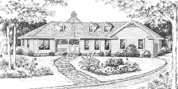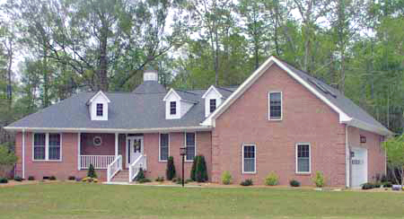 This photographed version of the dramatic angled plan 3705 is testament to the flexibility of our plans. It was built in brick rather than the siding of the original and the owners added a bonus room over the garage. Otherwise the dramatic octagonal great room and all the interior drama is retained. For great interior photos of another brick version see plan 3705.
