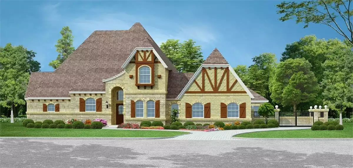 This simple yet spacious Tudor design has it all. As you enter the two story foyer, to the right is a cozy bedroom with walk-in closet and private bath. To the left is a study with coffered ceiling and full bath access, which allows it to double as an additional bedroom if needed. Also off the foyer is a space allowed for future stairs that would ascend to the second floor expansion of a game room, a media room, and a bedroom with a private bath. The family room, keeping room, and island kitchen give plenty of room to entertain. A large outdoor lounge invites guests to relax. An in-law suite/maid's quarters with private bath and walk-in closet is tucked away at the rear for privacy. Last but not least, the amazing master suite flaunts every amenity you desire for rest and comfort.