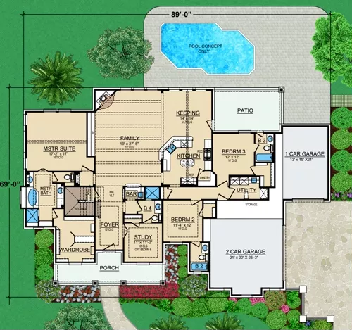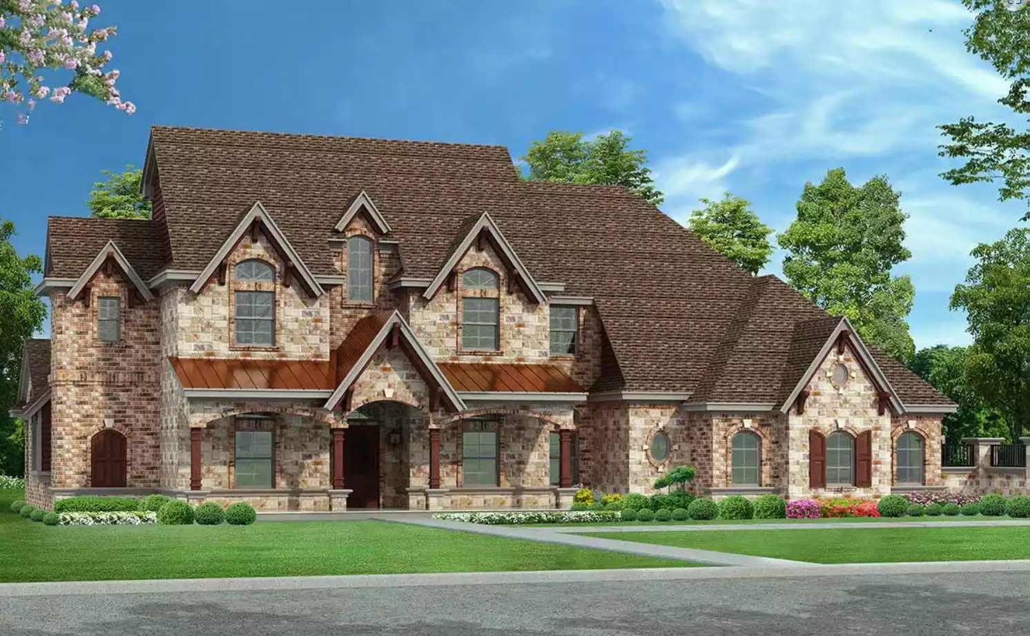 This classic colonial luxury home will lift your spirits from the moment you enter the front door into the large foyer. Off the foyer is a large study with bath and walk-in closet with easy access to the bar. Beyond the barrel vaulted ceiling, your eyes are drawn to the family room, keeping area and kitchen, which all come together in one large living space. The family room has built-in shelves and a warming corner fireplace. An eating bar with double sink and dishwasher separates the kitchen from the keeping area and family room. From the keeping room, walk out onto the cooking patio, perfect for entertaining or family outings. The master suite offers a luxurious bath with his and hers vanities, garden tub and separate shower, and a large wardrobe with built-ins. Two family bedrooms with baths and walk-in closets on this level both have easy access to the one and two car garages, making these great teen or guest rooms. A utility room, powder room and storage area round out the first level of this luxury floor plan. The upper floor, which is considered optional or bonus space, boasts two bedrooms, two baths and a game room.