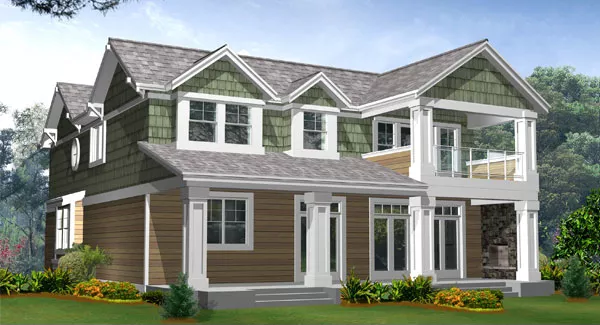 Welcoming the challenge of creating impactful curb appeal and an open-living floor plan to fit a compact footprint, the Woodland delivers on all counts. This popular plan offers a dynamic gabled exterior accented with brackets and stone. A dramatic foyer and luxurious curved stair lead to an oversize great room, nook and kitchen, complemented by a huge covered rear porch with fireplace. A formal dining room with walk-in pantry and butlery plus a work-at-home den complete the main floor. A luxury master suite with covered deck, two bedrooms with a Jack-and-Jill bath, a bonus room, loft-study and laundry comprise the upper floor. The Woodland packs a lot of features into a very appealing package.