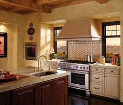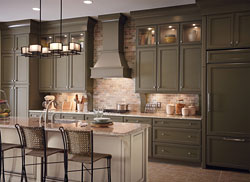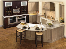 1 - KraftMaid® Kitchen Cabinetry This dream kitchen from KraftMaid® features customized panels that elegantly blend the appliances into a wall of cabinetry that's accented by a large center island workstation done in a contrasting glazed paint finish. It's part of KraftMaid's® Classically Traditional maple cabinet collection, which recently introduced two new paint colors — a muted green Sage and cream-toned neutral Mushroom. When it comes to creating a warm kitchen decor this collection is one of our favorites. Added touches include large cove moulding, prism glass doors and decorative hoods. Never hear a slamming door again with their Whisper Touch™ soft-close feature which is now standard on all cabinets. Check out the new KraftMyStyle free app for the iPhone, iPad and iPod Touch. It allows you to capture images, create photo collages and easily share your ideas. Their motto is "If you can dream it, you can design it!" Model: View complete product details for this kitchen design > |