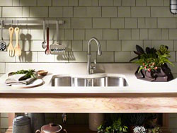 4 - Kohler® Octave™ Sinks At the Kitchen and Bath Industry Show (KBIS) in April, Kohler® launched the stainless steel Octave™ Kitchen Sink. This unique basin sink is available in both top-mount and under counter installation and features a curved back that not only looks great but also creates extra space that's perfect for large pots and pans. The Octave™ also comes with a bunch of cool accessories like stainless steel bottom basin racks, a sponge caddy and bottle of Kohler® Stainless Steel Cleaner. Model: Octave™ MSRP: Top-mount $427 | Undercounter $800 |