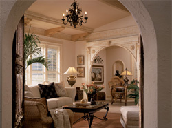 Make A Statement This elegant living room features ornamentally embossed mouldings around the arched entry. The designer created variations in ceiling heights, which are complemented by golden corbels and faux painted crown moulding by Fypon® to create a stunning ceiling. |