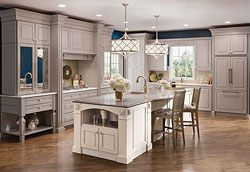 6-KraftMaid® Custom Cabinetry KraftMaid® launched lots of new products in 2013, including a selection of new on-trend colors and new accessories. Cabinets can now be customized with a selection of background inserts, glass door options, and brand new hardware. Top off KraftMaid's® extensive cabinetry options with a selection of new wood species and you can create a kitchen that suits your personal style, from classic country to luxe transitional. This specific luxe transitional kitchen features cherry cabinets in a pebble gray finish with coconut patina alongside maple cabinets in canvas, with cinder glaze and antique mirage inserts. Model: Read more about the KraftMaid® 2013 Products |