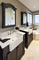 Rich Paisley Accents Create a beautiful master bath with a jacuzzi, spa shower and dual cottage farmhouse vanities by accenting the walls with an elegant paisley print in brown, aqua and black from Ravenscliffe wallpaper by Sandpiper Studios. Each washable roll is 20.5" wide by 16' 6" long and comes pre-pasted for easier installation. Model: Ravenscliffe wallpaper by Sandpiper Studios | TA91104 | $32.99 per roll |